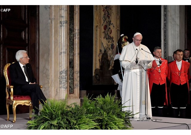 Após o discurso de saudação do Presidente italiano, o Papa tomou a palavra para expressar sua esperança na Itália diante dos sérios problemas e riscos do terrorismo internacional; do fenômeno migratório, por causa das guerras e desiquilíbrios econômicos; da falta de emprego para as novas gerações; das populações atingidas pelos terremotos.